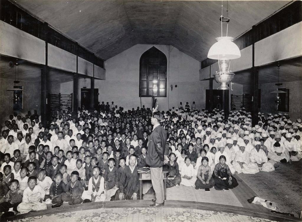 The headline features a flash-lit photo taken at a regular weekly prayer meeting in Pyongyang, where the average attendance was about 500 persons. Circa 1908.